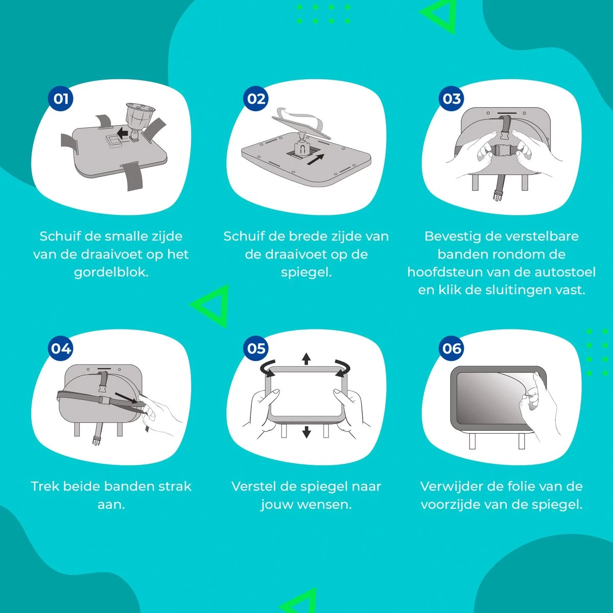 De bedoeling van deze spiegel is dat je deze aan een van de hoofdsteunen op de achterbank bevestigd, zodat jij via je achteruitkijkspiegel in de spiegel kijkt. De spiegel is in no-time te bevestigen door de handige banden die ook nog eens verstelbaar zijn. Bovendien kun je de spiegel bevestigen aan elke autostoel zonder vaste hoofdsteun.