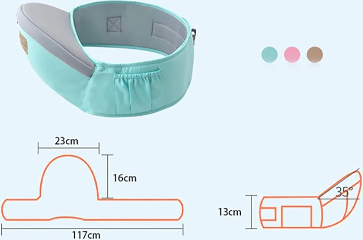 De heupdrager kan maximaal 18 kg aan en is verkrijgbaar in verschillende kleuren.