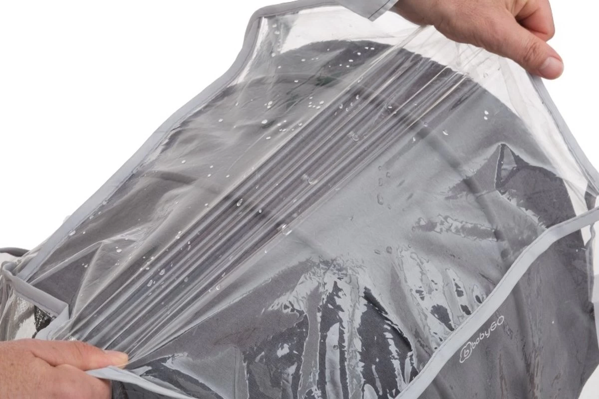 Je kindje kan heerlijk droog in de buggy zitten dankzij de universele regenhoes van Babygo! De transparante regenhoes is universeel en past op de meeste buggy’s. Je bevestigt de hoes makkelijk aan de poten van de buggy.