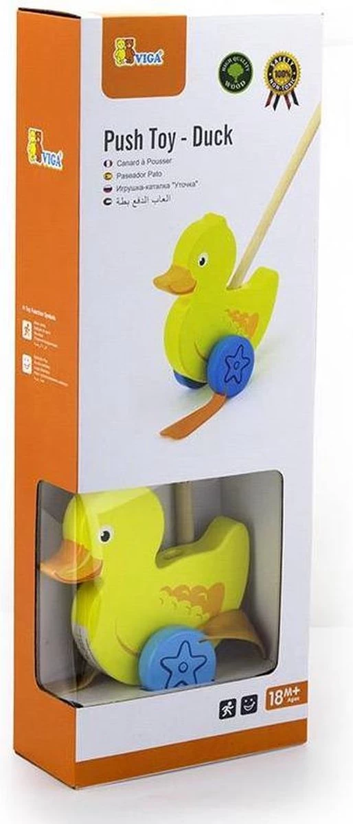 Duw of trek zachtjes aan deze mooie duwstok. Kleine voetjes komen in beweging om samen te lopen met deze leuke eend. De voeten van de eend klapperen vrolijk mee. Hoogte van de duwstok is 51 centimeter. Aanbevolen leeftijd is twee jaar en ouder.