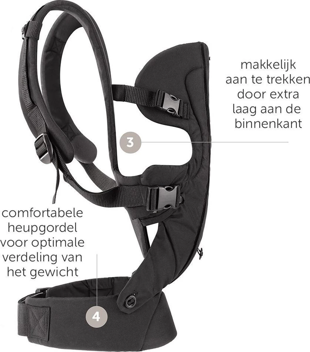 - Comfort voor baby’s en ouders – Veel comfort voor ouders en kinderen door de verstelbare schoudergordels, heupgordels en binnenkant. Bij pasgeborenen biedt de opvouwbare hoofdsteun een veilige ondersteuning voor het hoofdje.