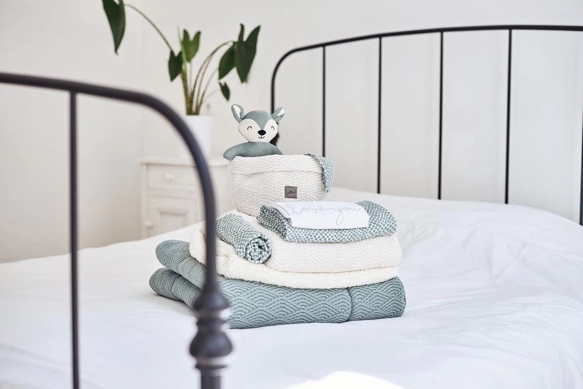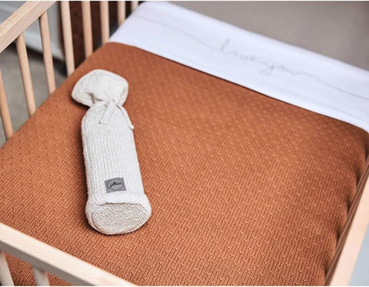 Met een wit lakentje kun je het bedje van jouw baby veilig, kort en strak opmaken. Door de zijkanten van het lakentje onder het matrasje te stoppen, slaapt jouw kleintje niet alleen veilig, maar heeft het ook een geborgen gevoel. Dit lieve lakentje met de tekst ‘love you’ past perfect bij de dekens uit het Basic knit thema en het Bliss knit thema van Jollein.