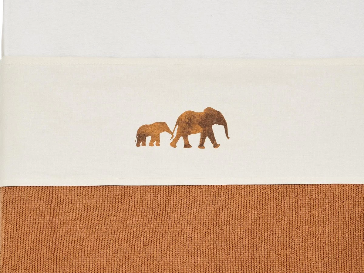Laken voor het ledikant met avontuurlijke opdruk van olifantjes in kleur. De opdruk is caramel kleur en het laken zelf is wit.