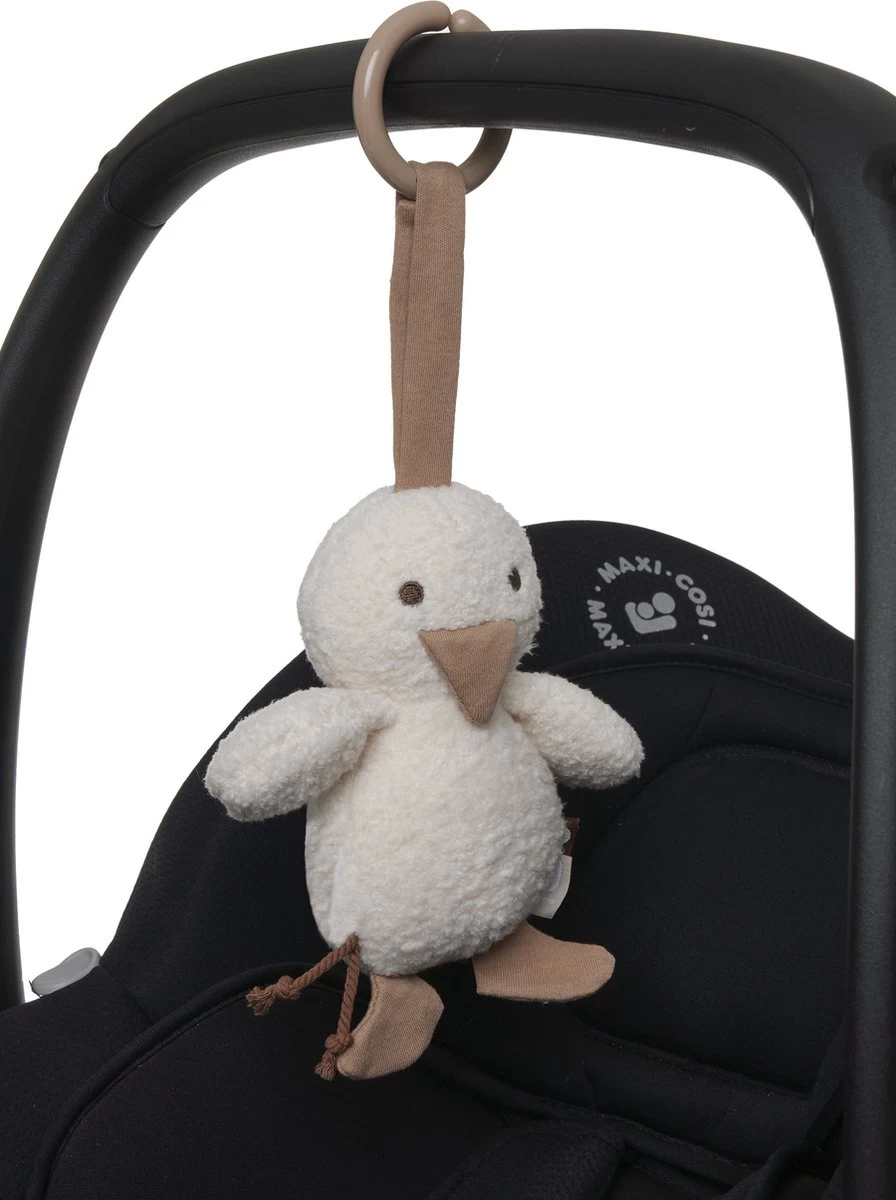 Hoe leuk is deze wagenhanger met schattig eendje! Naast dat dit ontzettend leuk staat, zal dit ook de motoriek van jouw kleintje stimuleren en de zintuigen prikkelen. Dit schattige eendje kun je met de plastic ring gemakkelijk aan de maxi cosi of wandel wagen bevestigen. De binnenkant bevat een belletje. Ook zit er een extra kleurrijke tag aan en twee korte koortjes. Het snaveltje en de voetjes van het eendje hebben een knisper geluidje. Daarnaast zit er op de buik van het eendje een baby spiegel. Dit lieve eendje zal zorgen voor vermaak van jouw kleintje! De wagenhanger is 18 cm. Ook verkrijgbaar in de vorm van een bloemetje.