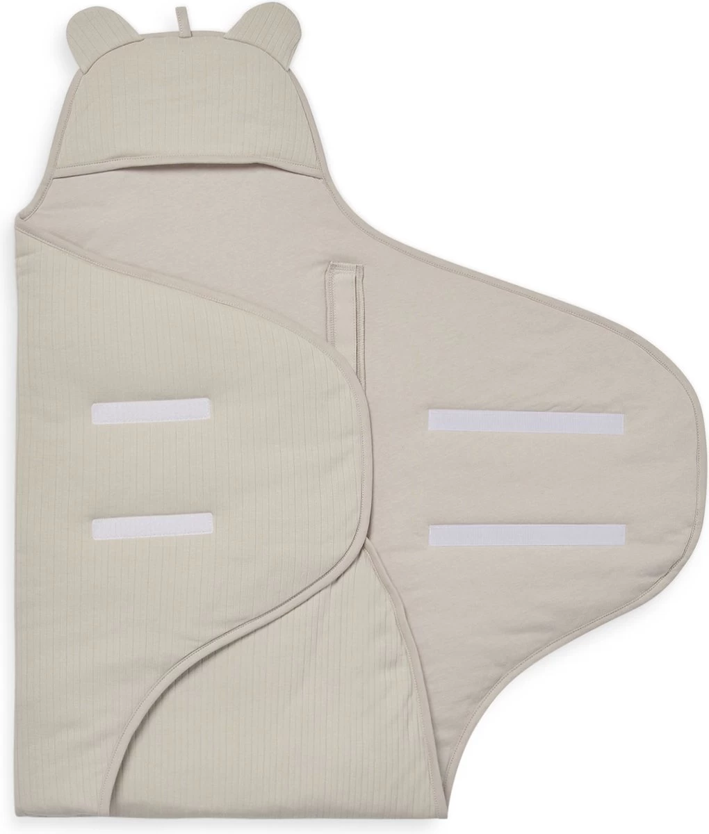 Wikkeldeken met gegarandeerd mega hoge cutenessfactor. De stof is heeft een ribbeltje aan de buitenkant en heerlijk comfortabel zacht aan de binnenkant en op de capuchon zitten schattige oortjes.