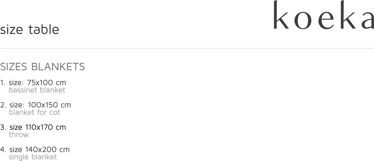 Wij snappen dat het lastig kan zijn om te bepalen welke deken je nu het beste kunt kopen. De juiste keuze hangt af van een aantal factoren en daarom heeft Koeka een keuzehulp samengesteld om je op weg te helpen. Deze “How to choose your blanket” keuzehulp vind je tussen de afbeeldingen. Meet de kamertemperatuur van je kinderkamer en bepaal wat de TOG waarde is van de slaapzak, pyjama en lakentje (als je die gebruikt). Raadpleeg daarna de keuzehulp om te bepalen wat het advies is voor de minimale en maximale TOG waarde van je deken.