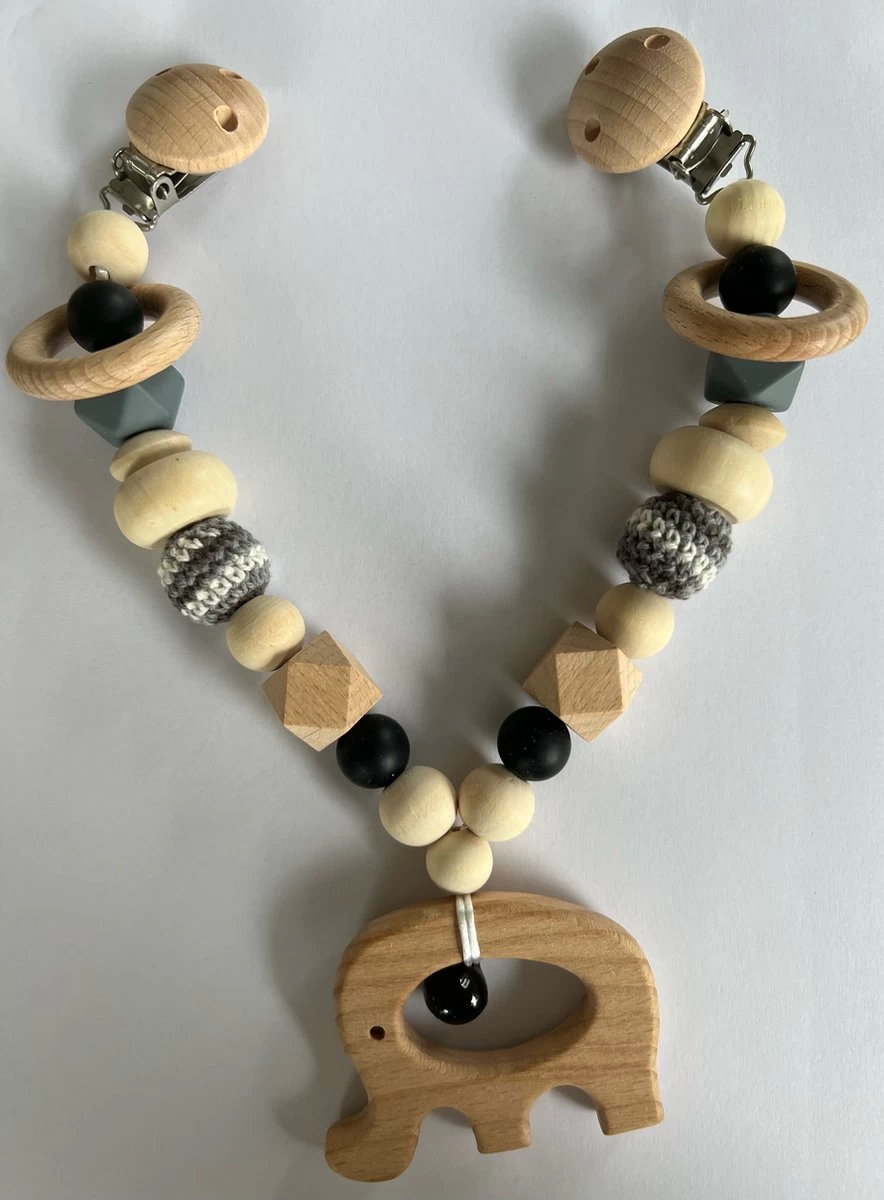 De wagenspanner bestaat uit een combinatie van meerdere soorten kralen waaronder hout, siliconen en/of gehaakte kralen. Deze combinatie zorgt voor een speelse look.