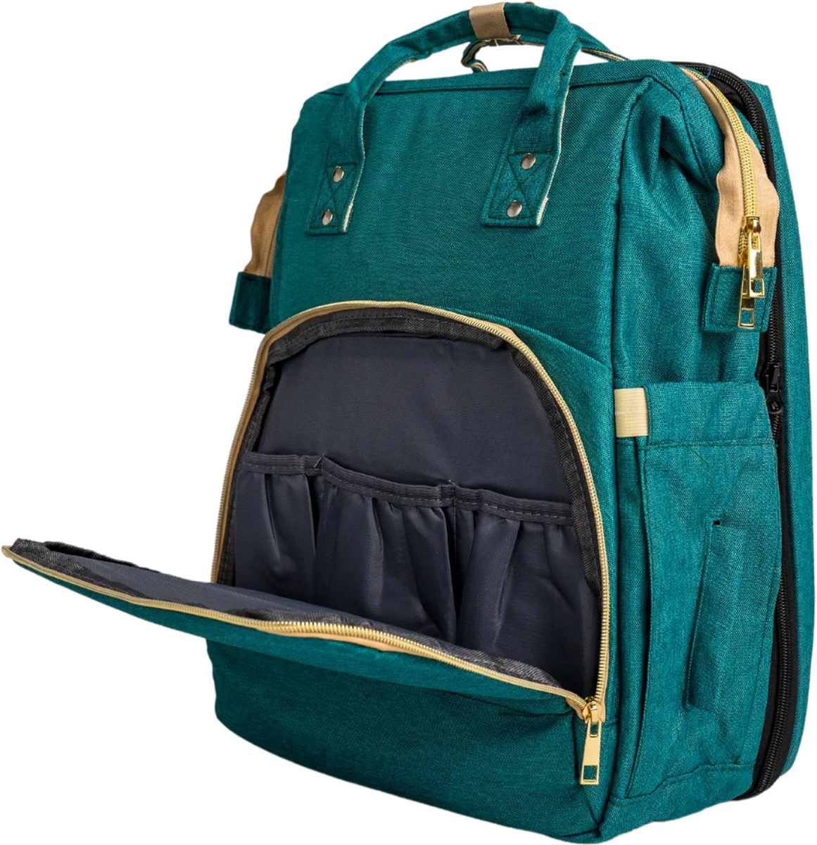 De luiertas heeft een groot compartiment met daarin 4 handige opberg compartimenten, die ideaal zijn voor de grotere items. Aan de voorkant van deze tas kun je 3 geïsoleerde vakken voor thermoflesjes vinden. Deze speciale vakken houden de (melk)flesjes op de juiste temperatuur. Ook is er een speciale gleuf aan de zijkant te vinden voor de babydoekjes die hierdoor makkelijk en snel te pakken zijn.