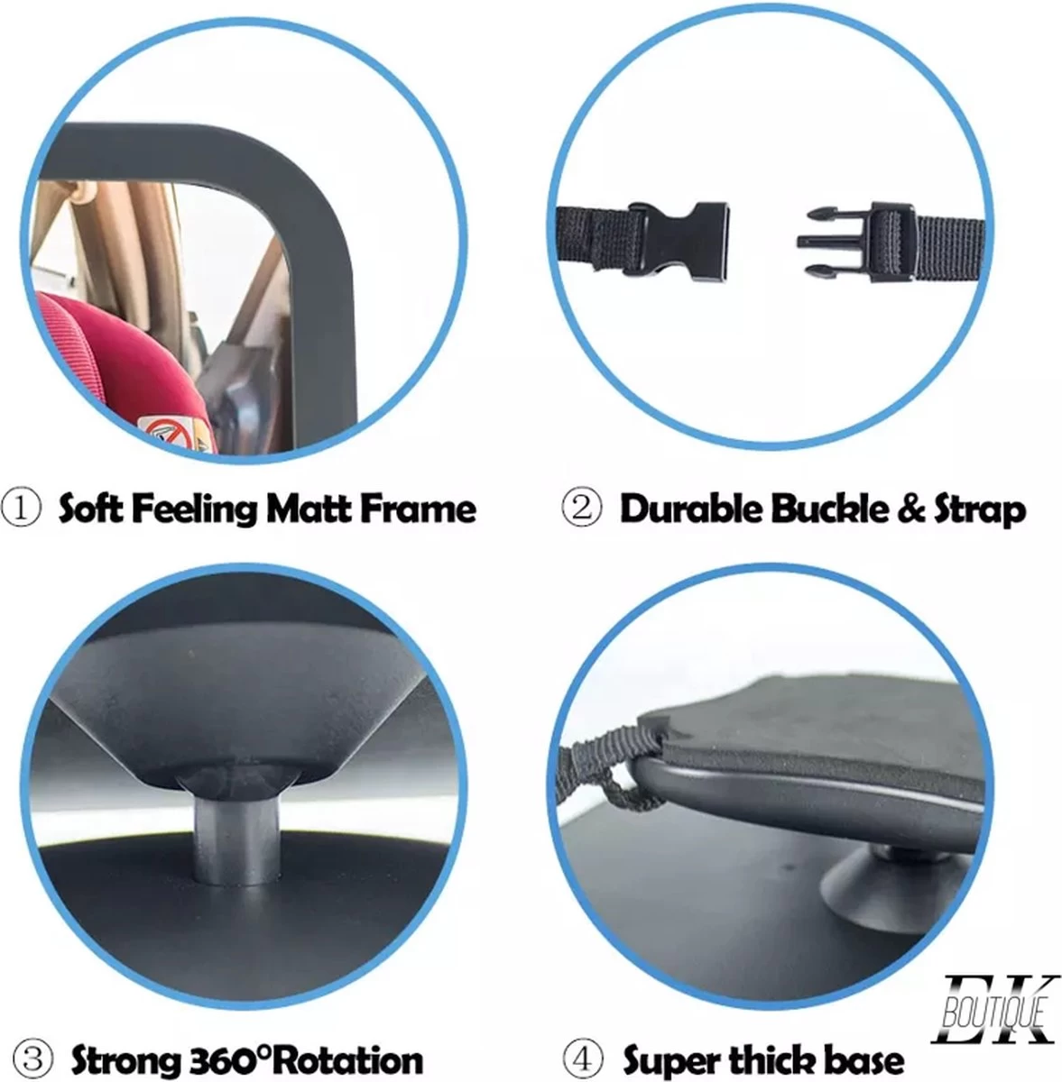 Door de verstelbare gespen blijft de spiegel goed zitten. Daarnnaast is het glas in de spiegel gemaakt van onbreekbaar materiaal (acryl) waardoor deze niet verspliterd. De spiegel zelf zit in een stevige frame van ABS waardoor er ook tijdens een ongeluk geen schade aangericht kan worden door deze kinderspiegel.