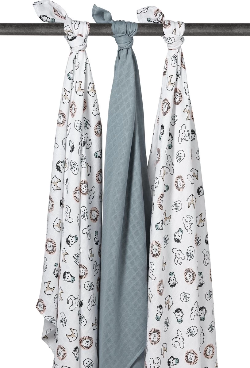 Met deze multifunctionele Meyco Baby Hydrofiele Swaddles 3-pack Animal, bedrukt met vrolijke diertjes, kun je met de verzorging van je kleintje alle kanten op. Of je ze nou als inbakerdoek, wikkeldoek, handdoek, borstvoedingscover, knuffeldoekje, spuugdoekje óf dekentje gebruikt, ze zijn standaard heerlijk zacht en comfortabel voor de tere babyhuid. Het 100% hydrofiel katoen neemt vocht zeer goed op en droogt ook nog eens supersnel. Onmisbaar en Ideaal om altijd bij je te hebben!
