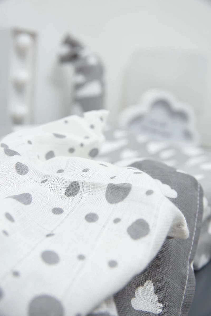 De starterset Feathers-Clouds-Dots is verkrijgbaar in diverse kleuren. Dankzij de rustige tinten, combineer je de hydrofiele items ook perfect met de complete collectie van Meyco Baby.