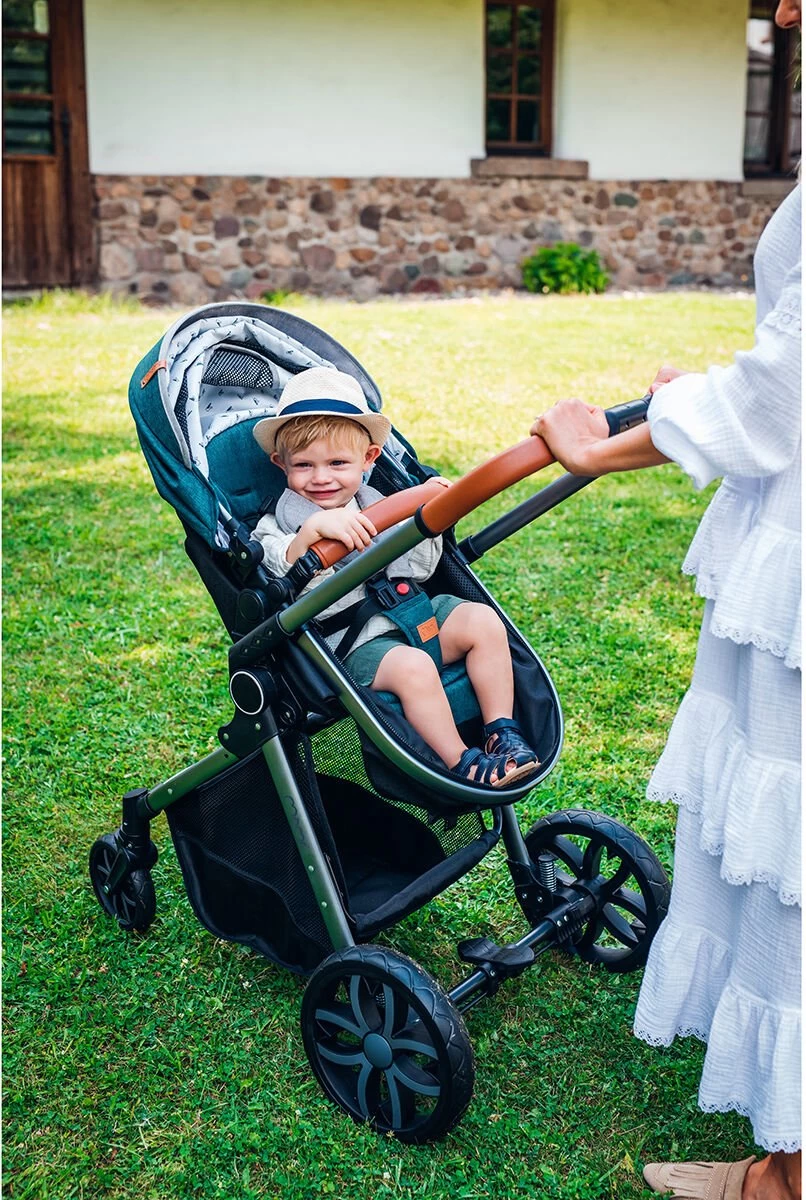MoMi LIMURU 2in1 ziet er erg chique uit in het zwart, met een gouden frame en elementen gemaakt van eco-leer. De kinderwagen is ook comfortabel in gebruik, snel op te vouwen en neemt weinig ruimte in beslag. Het is de perfecte keuze voor een redelijke prijs.