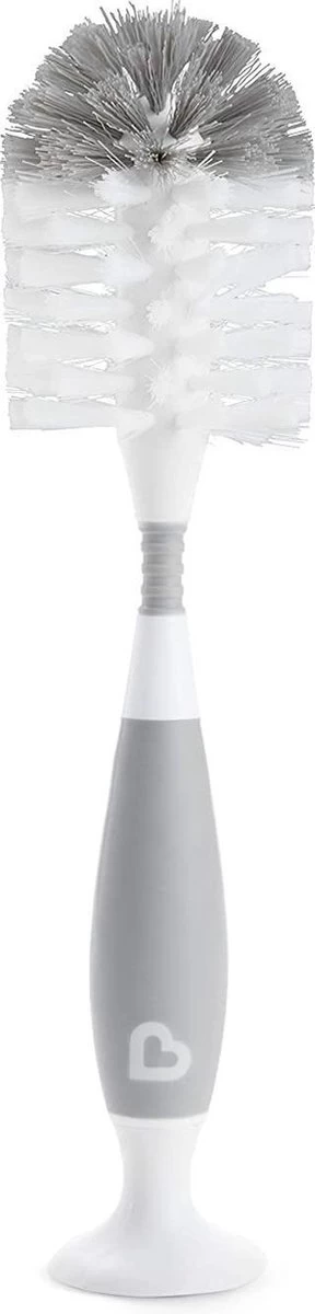 Zuigflessen schoon houden is essentieel voor uw baby’s gezondheid. Maar laten we wel wezen, bacteriën voelen zich uitstekend thuis in de keuken, en flessen reinigen hoort er nu eenmaal bij. Nu is er een slimme manier om uw betrouwbare flessenreiniger bacterievrij te houden.De Munchkin Deluxe Flessenborstel is uitgerust met een gepatenteerde zuignap. Wanneer u klaar bent met schrobben, kunt u de borstel gewoon recht op het aanrecht plaatsen. Zo droogt hij snel en worden bacteriën op veilige afstand gehouden. De antislipsteel biedt een betere grip voor ingezeepte handen. De duurzame nylon borstelharen rekenen streng af met vuil, maar zijn zacht voor baby’s flesjes.Bovendien is er een handige speenborstel opgeborgen in de steel, waardoor deze borstel ook geschikt is voor het reinigen van afkolfonderdelen, kleppen en andere kleine flesaccessoires. Met de Deluxe Flessenborstel Brush gebeurt flessen reinigen altijd hygiënisch en zonder kopzorgen. Zo hoeft u zich alleen druk te maken over alle flesonderdelen, potten en pannen die zich opstapelen, maar niet over het onzichtbare vuil.