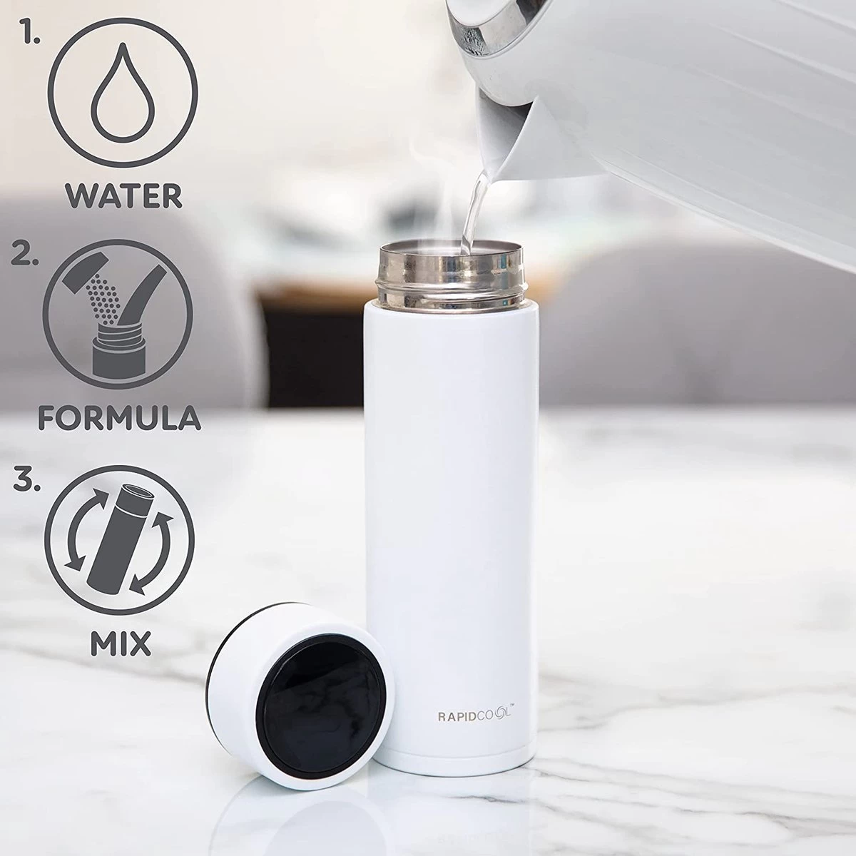 - MAKKELIJK MEE TE NEMEN: Gemakkelijk transporteerbaar om je flesjes te maken onderweg. In tegenstelling tot andere flessenmakers past de RapidCool gemakkelijk in de meeste luiertassen en er is geen oplader voor nodig. Je kan het overal mee naartoe nemen!