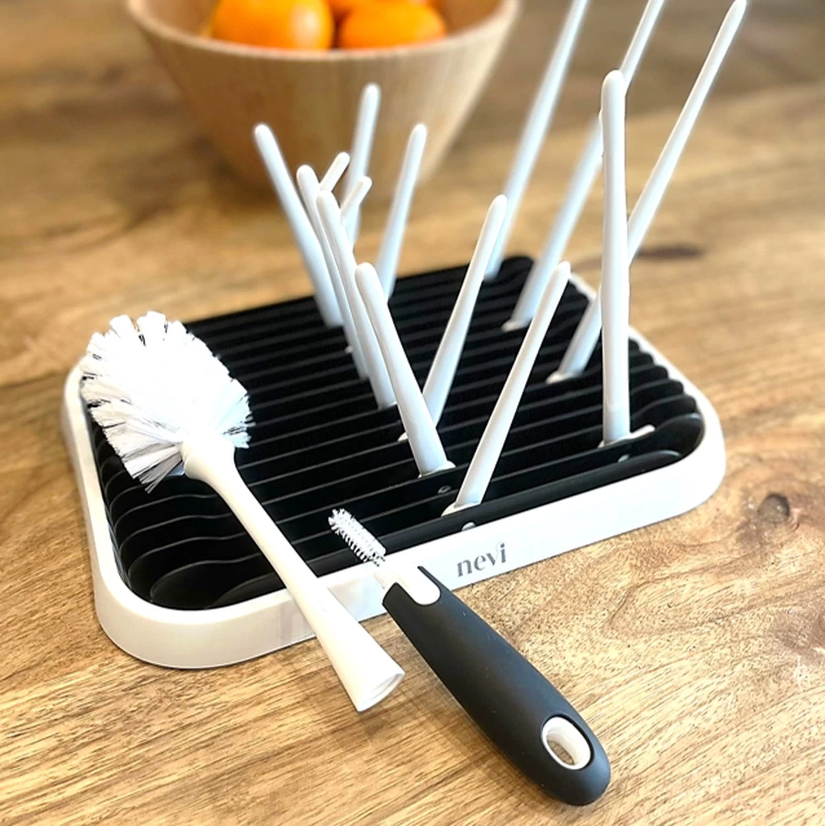 Het Nevi afdruiprek is niet alleen makkelijk in gebruik en hygiënisch, het rek heeft ook nog een erg handig ontwerp. Het stijlvolle afdruiprek heeft een strak en compact design. Dankzij dit ontwerp kun je gemakkelijk meerdere flessen of andere artikelen laten drogen. Denk hierbij aan bidons, spenen of bekers. Het afdruiprek met lekbak is compact en neemt daardoor niet zoveel ruimte in op het aanrecht.