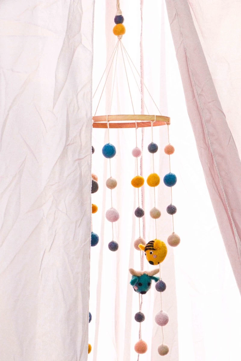 Een kleurrijke mobiel voor de kinderkamer. Deze schattige dierenmobiel is perfect boven het babybedje of de box. Alle diertjes hebben een symbolische betekenis. De mobiel is gemaakt van hout met dieren en bolletjes van vilt.