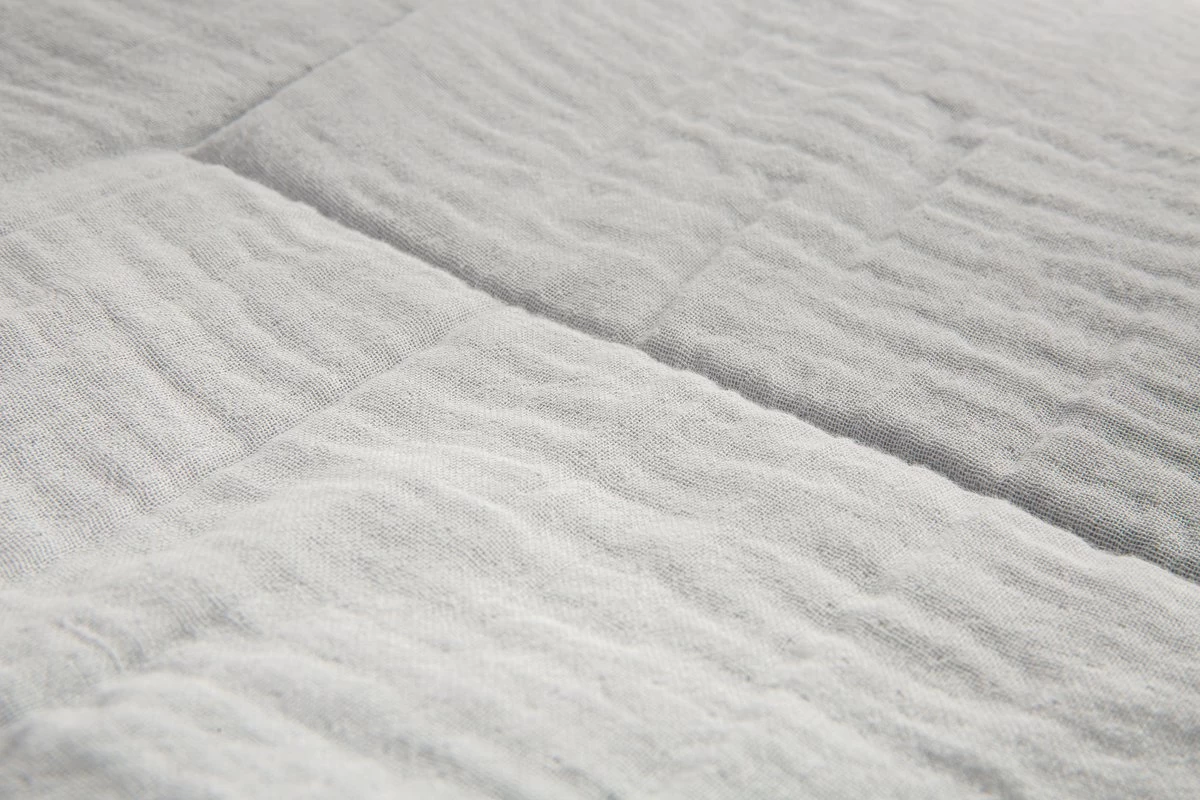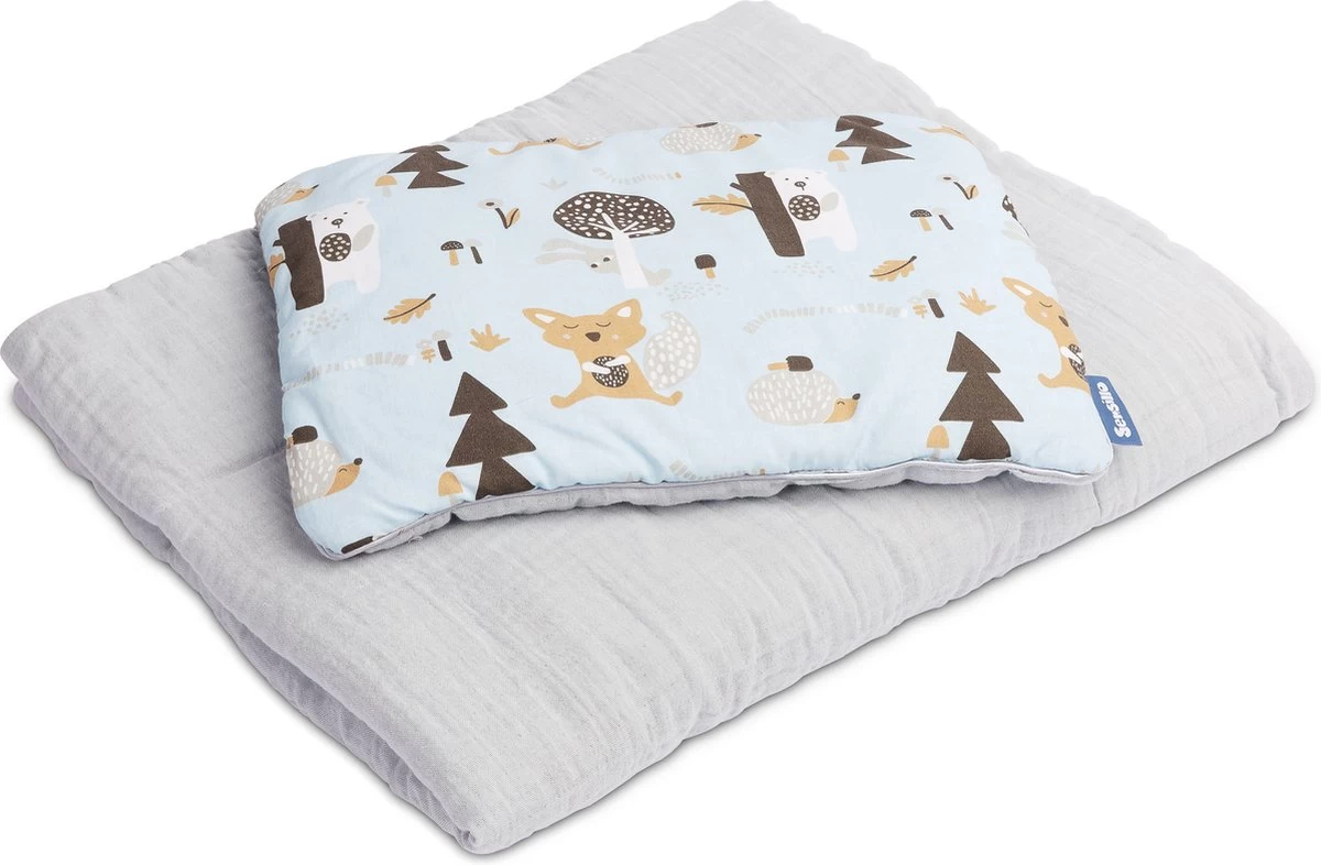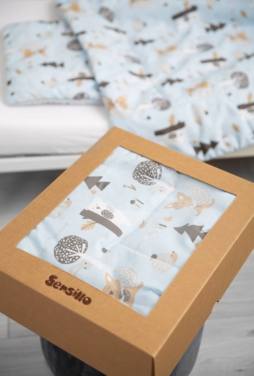 De wiegset is een combinatie van hoogwaardige mousseline aan de ene kant en bedrukt katoen aan de andere kant. Het bestaat uit een dubbelzijdig plat kussen en een dekbed met vulling. De combinatie van natuurlijke en luchtige stoffen is perfect voor een kinderbedje, gondel of wieg. Het is gevuld met anti-allergisch siliconenvlies. De set is verpakt in een smaakvolle kartonnen verpakking, perfect voor een cadeau.