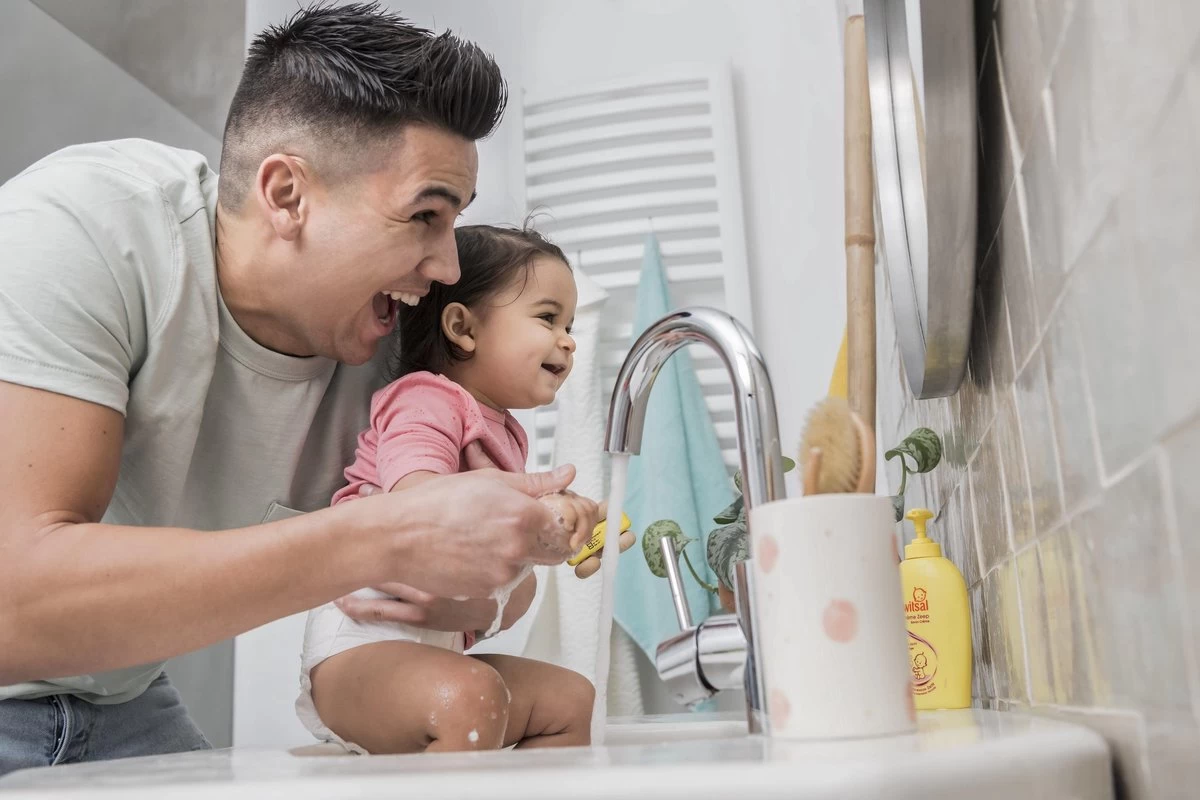 Een beetje zeep op de handen, goed wrijven en daarna het schuim afspoelen.